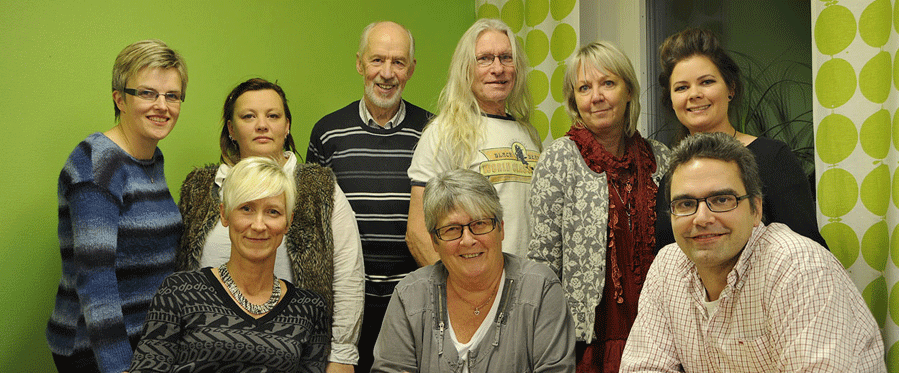 Fr vänster: Mona, Anne, Billy, Jerry (egenanställda) samt Helen och Malin från projekt Flexibelt Entreprenörskap. Katrin, Monica och Patrik är de egenanställda längst fram