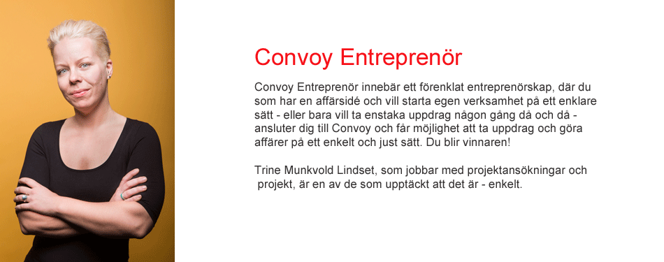 Väljer du Convoy Entreprenör väljer du som egenanställd hos Convoy också att utveckla och marknadsföra dina tjänster, att diskutera innehåll, pris, omfattning och kvalité på dina uppdrag, ja att tänka som om du har eget - allt med stöd av oss. Du arbetar så mycket du vill och kan - det är helt upp till dig. Du utvecklar nya tjänster utifrån din egen kompetens och dina intressen - när du får lust. Du samråder med oss innan du erbjuder marknaden tjänsterna, så att vi vet att dina tjänster funkar hos oss.